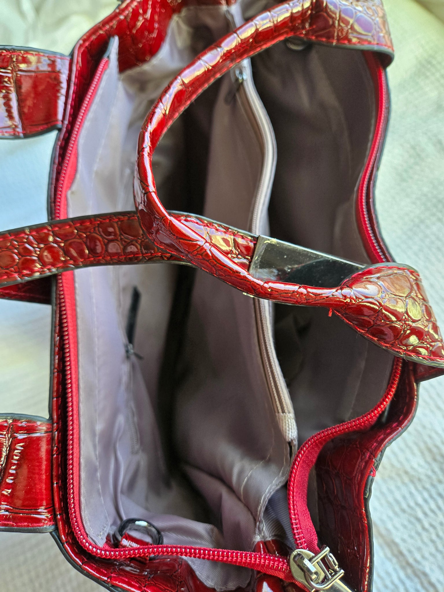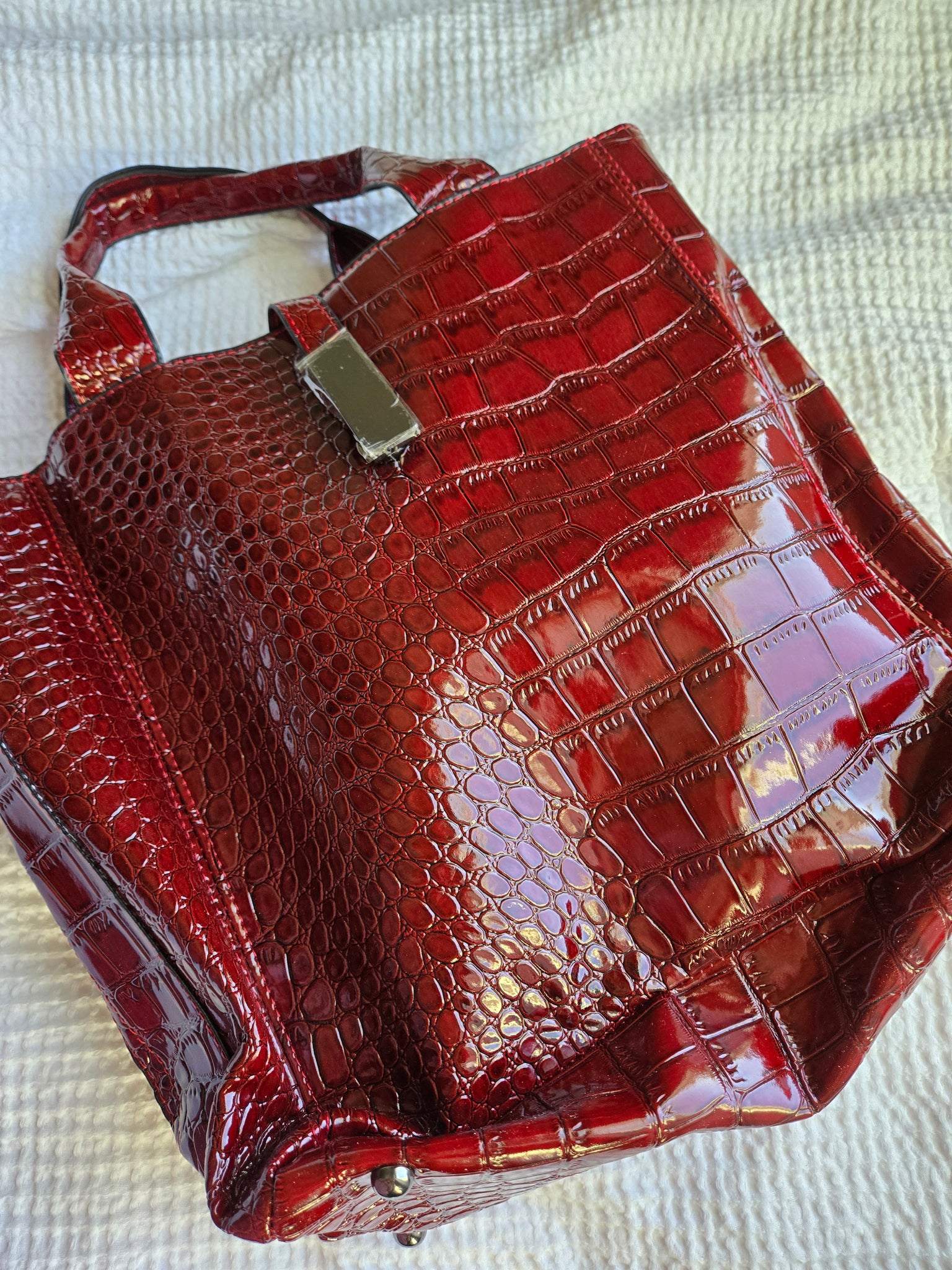 Luxury Handbag in leather/alligator type print/feel. Gorgeous for everyday or that special outing. Very professional and stylish. Maroon, wine red type color with closing tab. 3 compartments allowing for storing lots of lady goodies and more or less should you choose so. Nice shorter handles for easy carry. Bottom has little stubs so lifts a tad if need to put on floor under table while dining, etc. Just lovely to add to your wardrobe. See photos for size determination and features.
